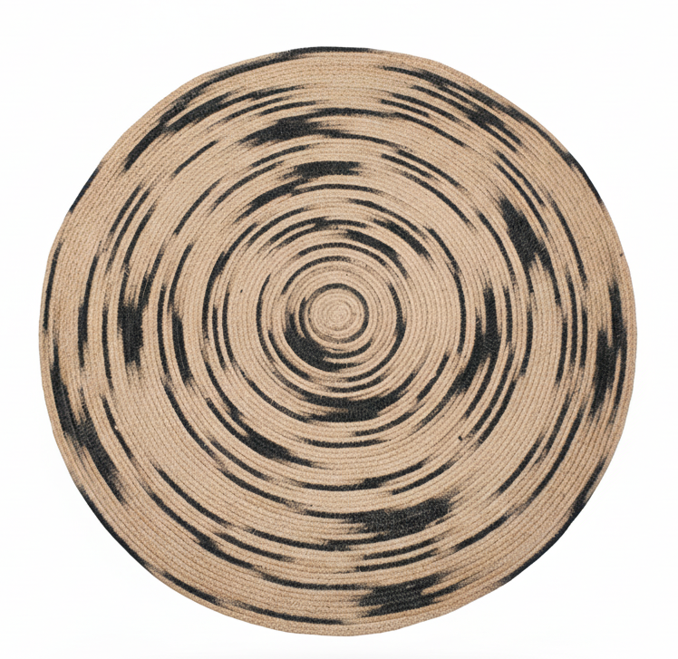 The foundation is built from durable, sustainable natural jute fibers, which are then beautifully blended with dynamic, sporadic bands of black. This unique concentric design ensures that no two rugs are exactly alike, giving your space a truly personalized feel. The round shape is perfect for anchoring a dining set, highlighting a reading corner, or adding an edgy, contemporary layer to your living room.