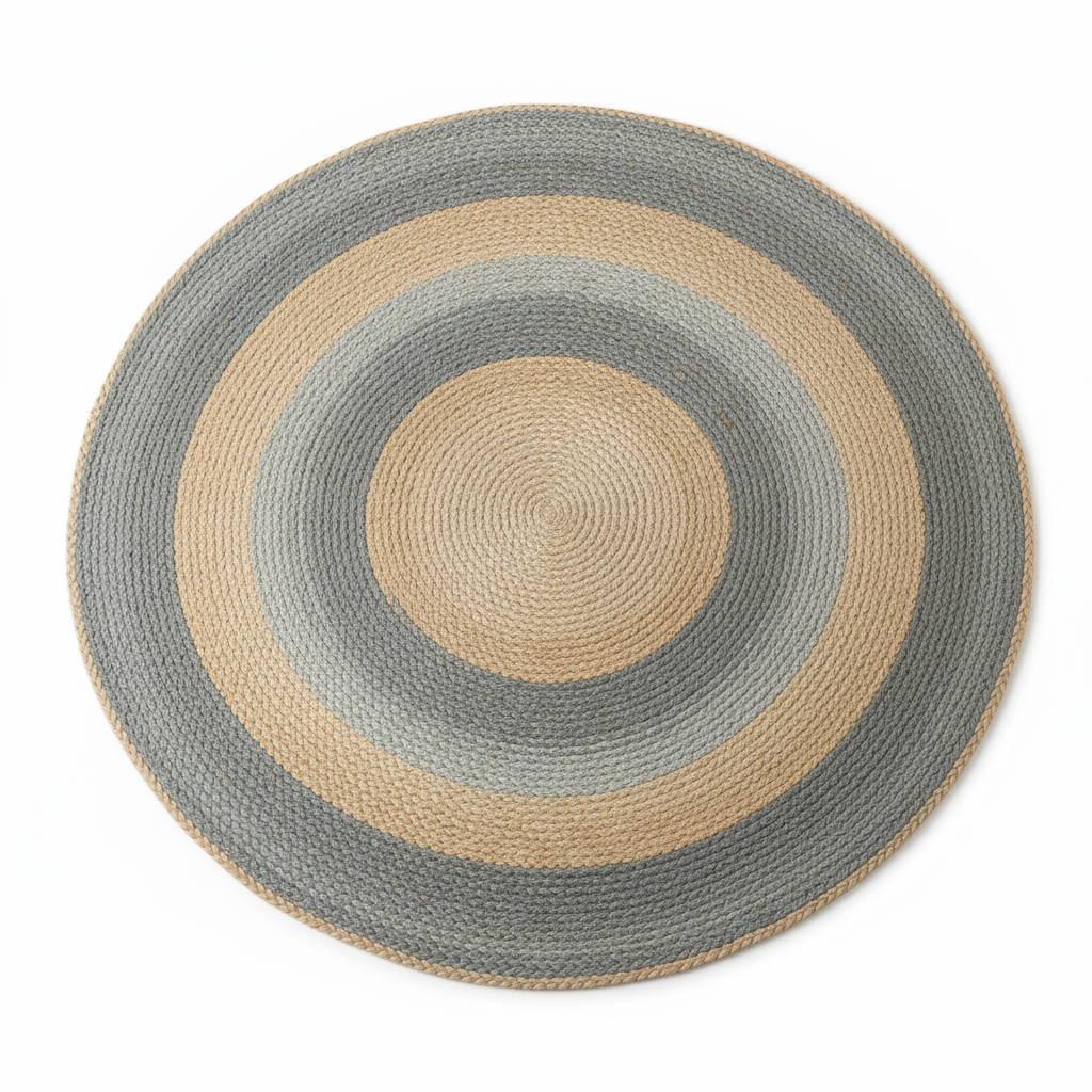 Introduce a sense of calm and contemporary elegance to your home with this stunning Multi-Tone Round Jute Rug. This hand-braided piece features a sophisticated palette of natural tan, warm beige, and muted coastal gray in beautiful concentric circles. The layered color blocking gives the rug depth and visual interest while remaining incredibly versatile.